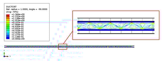 In detail, the parameter DUCTCRT exposed in Figure 15 includes ductile, shear, forming limit diagram (FLD), forming limit stress diagram (FLSD) and the Müschenborn–Sonne forming limit diagram (MSFLD) criteria for damage initiation in ductile metals and, in particular, includes in Abaqus/explicit the Marciniak–Kuczynski (M-K) and Johnson–Cook criteria for the evaluation of the damage initiation.