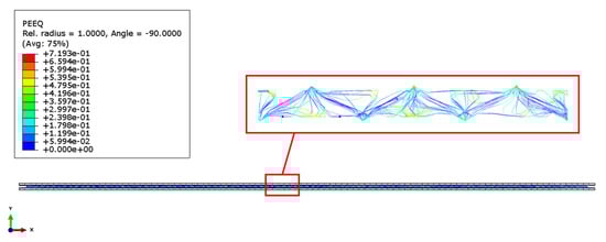 As can be appreciated in Figure 14, the thickness of the panels after deformation reduces to about half of the initial thickness. Furthermore, from Figure 15, it is clear that the damages of the metallic core are condensed at the vertices of the pyramidal structures, while in Figure 16, the plastic strain in the metal lattice core can be appreciated.