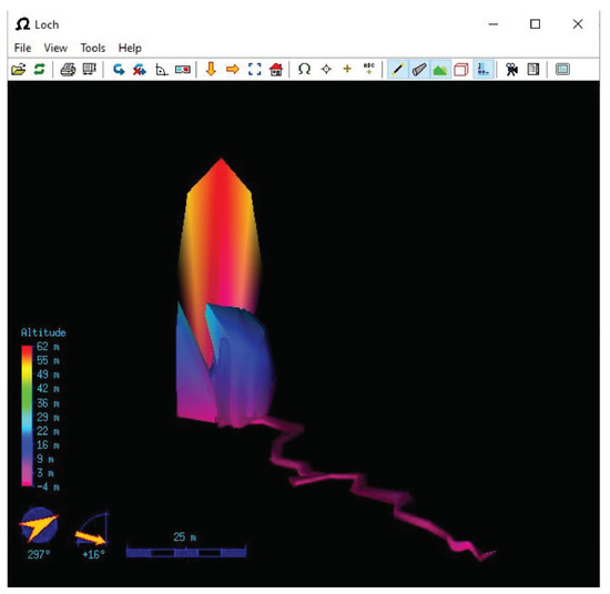 Recently, the use of clinometers and compass was substituted by the spread of handheld topographic instruments such as portable laser range finders equipped with digital clinometers and compass [1,7]. The measurements acquired with the laser range finder are stored in the device or, currently, in a phone app (e.g., TopoDroid) linked to the range finder where the caver can visualize the entire survey [8]. Moreover, in every station point, the survey procedure implies a series of circular measures to trace a transverse section of the cave obtaining a discrete three-dimensional representation. The app allows the caver to manually draw the cave outline adding details to the survey (Figure 1). The obtained final result is a subjective representation of the cave done by the caver on a network of measured points. The resolution and accuracy of the three-dimensional model are often highly heterogeneous and rely on the caver’s ability that connects the sequence of dots and creates the representation of the surveyed area.