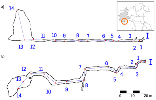 The Gazzano cave (125 Pi/CN—Regional cave cadastre) is located in the Maritime Alps in the municipality of Garessio, Northwestern Italy (44°11′52.18″ N, 8°0′40.74″ E) at 574 m above sea level elevation (Figure 2). The cave was accidentally discovered during the excavation of a quarry and explored in 1898. In the past, several peculiar features were looted and, nowadays, the marks of these actions are still visible. The Gazzano cave is an important natural site for the preservation of biological diversity because it is a bat (Rhinolopus spp.) hibernation site and a natural refuge for European cave salamanders (Speleomantes spp.).