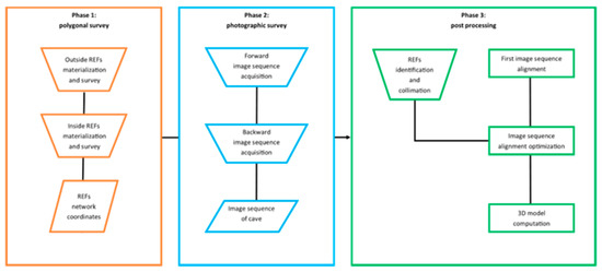 The proposed method is divided into three different phases (Figure 3): (i) REF Polygonal survey; (ii) photographic survey; (iii) post-processing. Firstly, the cave needs to be located and framed by a topographic survey. This step is fundamental for the correct orientation and georeferencing of the photo sequence. The operation starts outside the cave by properly defining two, or more, reference benchmarks to refer the whole survey to a geographical reference system rather than a local one. Subsequently, measurements continue inside the cave by selecting a sequence of reference points on cave walls and features. The materialization of inner benchmarks should be carefully realized without damaging cave features and by minimizing the impact; for these reasons, a small varnish mark with color in contrast with the surroundings (e.g., red or orange) can be sufficient because the distance between the target and the photo camera is always limited. Additionally, to maximize its accuracy, the polygonal survey should be carried on twice in both directions to close the polygon. The survey phase of benchmarks is performed using a portable range finder capable of measuring and storing angles and distances contemporarily. The position of external reference points can be acquired using GNSS systems.