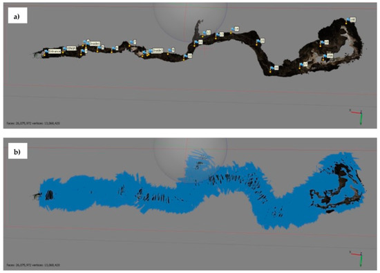 As the images’ quantity was noteworthy (1597), the survey was processed in four separate groups and then merged into a unique 3D model (Figure 7b). The use of image groups is vital to ease the processing of images and reduce the processing time. This is encouraging as the final output can represent the cave and its features.