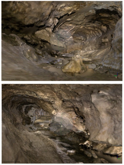 Moreover, the SfM capability allows portraying the cave interior, too (Figure 8). This feature can constitute the basis for realizing a low-resolution representation of the cave for virtual exploration and tourism purposes. The only limit of the proposed methodology is the complete representation of the final chamber. The lighting and humidity conditions did not illuminate its upper sector adequately, as it reaches 27 m (Figure 1 and Figure 2a). A possible solution is adopting more acquisition points at different elevations inside the final chamber using cavers techniques to climb the wall and reach the top of the chamber. The final result is a continuous model of the cave with a good resolution and accuracy. For traditional methods, the use of SfM allows the reconstruction of a 3D model without the manual interpretation of cavers that should not connect the different benchmarks with the manual representation of the cave.