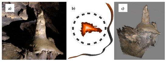Near the final chamber, an element of interest was noticed and used to focus on the experimentation of a high-resolution survey (Figure 9a). One of the most precious elements of the Gazzano cave is the presence of a big stalagmite that is located in the last part of the cave. It is close to the cave walls but its distance from the cave wall is sufficient to capture it in almost all directions as schematized in Figure 9b. According to the proposed approach, 92 photos of the stalagmite were taken, following a circular path around the stalagmite capturing it from different heights to frame it from different points of view. To scale the model, five distances were measured on the speleothem. Natural marks and recognizable features were selected without marking the object with the purpose of its complete preservation.