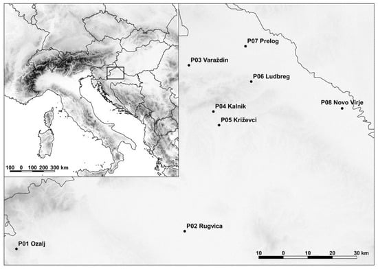 A total of 101 individuals from eight wild hop populations were collected in the northwestern part of Croatia, from the areas belonging to the sub-Pannonian microregion of the Pannonian macroregion and partly to the Dinaric macroregion [50]. The sampling sites were chosen to cover uniformly the region of interest. None of the sampling sites were located in natural protected areas. The sampling area of 1 km2 per site was selected and the minimum collection distance between adjacent plants was 250 m to avoid the sampling of clones [51,52,53]. Thus, 10 to 15 plants were sampled per each site. Geographical data for each individual were obtained from the station GPS (Figure 1, Table S1). The climatic data on annual mean temperature and annual precipitation of each sampling site were taken from the WorldClim database [54]. The lowest values of mean annual temperature and the highest amount of annual precipitation were recorded for the sampling site of population P1 Ozalj, 9.40 °C and 1215 mm respectively, the population sampled at the highest altitude (301.20 m a. s. l.). The sampling site of P8 Novo Virje is characterized with the highest mean annual temperature (10.80 °C) and the lowest amount of annual precipitation (776 mm) (Table S1). Among the 101 individuals sampled, 38 of them were male and 63 were female plants. Sex ratio (female:male plants) ranged from 1:0.66 in P1 Ozalj to 1:3.33 in P6 Ludbreg, being 1:1.66 across all the populations.
