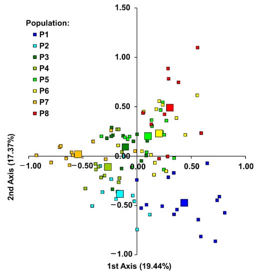 Factorial correspondence analysis plot showing the genetic relationships among wild hop samples (n = 101) from eight populations in Croatia. Each individual genotype is indicated by a small symbol, while population barycenters are represented by larger ones.