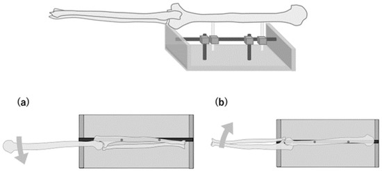 Schematic illustration of specimen fixing. The ulna is fixed to the experimental table when measuring the movement of the ulnar nerve proximal to the medial epicondyle (a). The humerus is fixed to the experimental table when measuring the movement distal to the medial epicondyle (b).