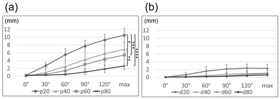 Line graph illustrating the movement of the ulnar nerve proximal to the medial epicondyle (a) and distal to the medial epicondyle (b). *: p20–p40, **: p40–p80, ***: p20–p60, ****: p20–p80 (*: p < 0.05, **: p < 0.01, ***: p < 0.05, ****: p < 0.001). max, maximum.