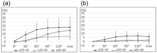 Ulnar nerve strain from extension to maximum flexion demonstrated no significant difference in each section, either proximal or distal to the medial epicondyle (p = 0.30 and p = 0.08, respectively; Figure 5). However, strain revealed the maximum value in the section of p20–40 and had an 18% increase in maximum flexion compared with elbow extension; additionally, the change in strain during mild flexion (0–60°, 15%) was significantly larger than that during deep flexion (60–120°, 3%; p < 0.05) (Figure 6). In contrast, strain in the section of p60–80 changed by 5% and 9% during mild and deep flexion, respectively (p < 0.05).