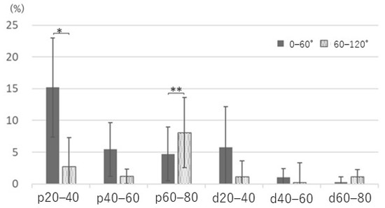 Comparison of ulnar nerve strain with elbow flexion divided into mild flexion (0–60°) and deep flexion (60–120°). p20–40: 15% versus 3%, *: p < 0.01; p60–80: 5% versus 9%, **: p < 0.05.