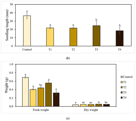 Figure 1b,c presents the growth characteristics of seedlings harvested after the experiments. Seedling lengths were significantly different between the control and treatment groups (p < 0.05). The greatest seedling length (36.43 mm) was found in the control plants, and that of the treated plants ranged from 18.41 mm to 24.52 mm.