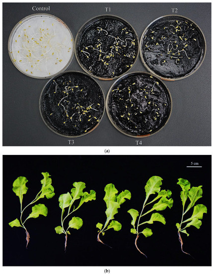 The elemental composition analysis also confirmed the accumulation of aluminum in dried seedlings with fertilization (Figure 2). There was a clear correlation between the increase in aluminum levels with the addition of P-BC-LDHs. Lettuce seeds imbued in T1, T2, T3, and T4 had average aluminum accumulation values of 1.10, 1.39, 2.36, and 2.81 mg/g, respectively. In contrast, this metal was almost absent in the control lettuce. In addition, a dosage-dependent content of magnesium in seedlings was found, but a slight drop in phosphorus was verified in enhanced concentrations of P-BC-LDHs. It has been established that phosphorus deficiency is generally correlated with aluminum because of the formation of insoluble aluminum phosphate compounds, by which the absorption of such nutrients becomes ineffective [33]. In these experiments, we proposed that such undissolved complexes could be formed and progressively accumulate in the root tissues of lettuce seedlings, with increasing aluminum levels coinciding with the P-BC-LDH supply, inducing a decreased translocation of phosphorus to their stems and leaves. In addition, polycyclic aromatic hydrocarbons (PAHs), which are multi-ringed aromatic compounds, are formed during biochar production due to incomplete combustion [34,35]. These organic pollutants in P-BC-LDHs may be considered one of the factors inhibiting the growth of lettuce seedlings. It was reported that PAH-induced responses in several plants included the reduction of seed germination, hindered seedling development, and decreased root elongation due to the variable consequences of interference with cell wall modification and expansion, membrane permeability, and photosynthesis [36,37,38,39]. Therefore, to avoid any potentially toxic effects, the quantitative analyses of metal elements and PAHs, as well as pretreatment of P-BC-LDHs, should be performed prior to application for seed germination. A photograph of seed germination in response to different intakes of P-BC-LDHs on day five is shown in Figure 3a.