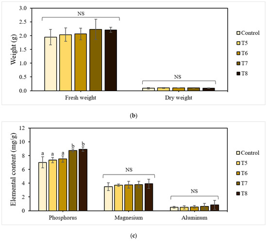 The elemental analysis (Figure 4c) further highlights the effect of the dosing quantity of P-BC-LDHs on plant nutrient uptake. The assimilation of P-BC-LDHs in substrates resulted in an excellent phosphorus concentration within the plant tissues. In particular, a more significant influence on phosphorus uptake was observed in the treatments with higher dosages (T7 and T8), which increased by up to 21% and 27%, respectively, compared to the other treatments and controls. Simultaneously, a larger amount of magnesium (by a factor of approximately 1.1) was also detected for all the treated lettuce. This suggests that the resultant fertilizer could provide this agricultural growing media with more available nutrients for plants, and therefore contribute to satisfactory vegetable growth that is superior to those grown without P-BC-LDHs. The changes in the aluminum level, which is a potentially toxic constituent for crop production and a consideration in this study, were extremely modest, with a statistically insignificant relationship between individual treated and control plants (p > 0.05). In general, aluminum is typically found as a mineral in the soil, and in strongly acidic soil, especially at pH values lower than 4.3, it will severely impede the physiological and biochemical processes of plants [40]. Consequently, their productivity will be impeded due to its excessive solubilization and the enhanced presence of trivalent aluminum (Al3+), which is known to be the most toxic form [40,41]. Due to the alkalinity of P-BC-LDHs (Table 1), the application of P-BC-LDHs could compensate for the acidic growing media used, which greatly assisted the amelioration of aluminum phytotoxicity. In this study, the pH measurements of each substrate were performed after 21 days. The effectiveness of these materials in improving the pH of all growing media was demonstrated, with values ranging from 4.7 to 5.2, which was comparable to those without amendment (4.4). Furthermore, it has been proposed that young seedlings are more prone to aluminum stress than older plants [42]. Therefore, the lettuce observed in the present study did not demonstrate any signs of toxicity even at high applied concentrations of P-BC-LDHs, which was inconsistent with their interaction with seed germination.