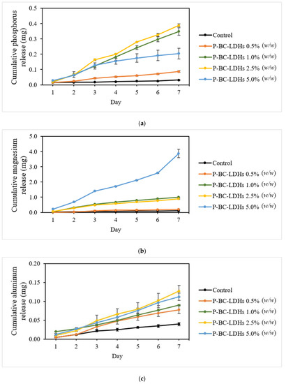 Some studies have hypothesized that LDHs could delay the discharge of nutrients because of the mechanism of the anion exchange reaction taking place within its structure, and LDHs could therefore be targeted as a slow-release fertilizer. Consequently, the feasibility of P-BC-LDHs for controlled nutrient release for agricultural uses was also investigated. In the present experiments, for the first time, the release characteristics of magnesium and aluminum in real substrate systems were examined, in addition to those of phosphorus because current studies regarding biochar-based LDH composites have primarily focused on phosphorus dissolution under water conditions.