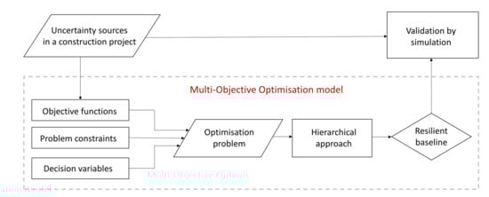 The structure of this study is organized as follows. The following subsection begins with a discussion on the nature of uncertainty in construction projects. In Section 2.2, the taxonomy development process is described. Resilience framework is discussed in more detail in Section 2.3. In Section 2.4, the MOO model for resilient scheduling is presented. The Section 3 consists of two parts, where the solving process is discussed in more detail in Section 3.1, while the resilient scheduling approach is validated on the construction project example by simulating two baseline cases in Section 3.2. The overall conclusions and suggestions for future research are given in Section 4.