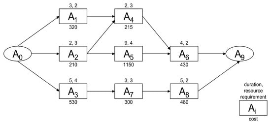 The multi-objective optimization model was applied to the test case adjusted from Reference [] to provide a detailed description of the solving process for the multi-objective optimization problem on a single problem instance. The activity list for the problem instance is given in Table 5. The project network is shown in Figure 3, along with activities’ durations in months, their resource requirement per activity, and activities’ direct costs in thousand of financing units. Only one resource type is required during project execution, of which 7 units are available at any time. Since the model proposed herein requires cash-flow analysis, financial data, and contract terms are provided in Table 6. All integer values considering financial input are given in thousand of financial units.