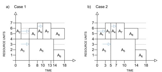 The concept of resilient scheduling is built on the idea of providing enough time intervals in the initial baseline structure so the schedule is able to absorb disturbances caused by the impact of uncertainty. A common approach is to provide enough time floats in the initial solution by the use of different surrogate measures [,,,,]. This way, the stability of a schedule is approximated under the low cost of computational complexity, providing a simple solution in the overall computationally demanding optimization process.