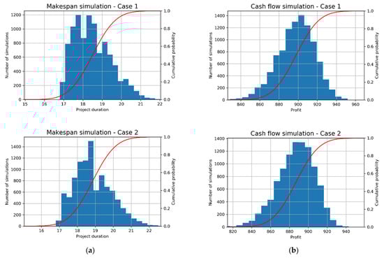 To validate the resilience of the proposed scheduling process, a probabilistic simulation analysis was conducted for different baseline solutions of the previously presented test problem. Due to the computational complexity of the underlying scheduling problem, the simulation analysis was bounded on two distinctive instances. The first baseline schedule refers to the single makespan instance obtained by solving the MOO test problem as previously described, while the other solution is found when the second and the third objective function were shifted in their hierarchy. For the second case, timeline minimization is still on the highest level of hierarchy in the optimization process; however, the profit maximization is in the second place of importance, and the surrogate measure maximization is at the bottom considering the hierarchical importance of objective functions. This way, the evaluation is made to compare the simulated behavior of two different baseline schedules: both of them have a duration of globally optimal 18 months, but in the first case, the SM value is higher and the baseline profit value is lower compared to SM value and baseline profit value from the second case. Objective function values for both cases are given in Table 7, along with the baseline start times for all activities, including dummy start and dummy end. The credit limit was set to 280 thousand of financial units in both cases.