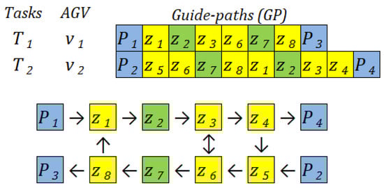 The guide path of the transportation system is a sequence of the set of zones that consists of lanes and crossings. In addition, parking places are also used in the transportation system, but they are not elements of paths. Each parking place situated in a zone is neighboring at least one guide path zone , and an AGV can move from its parking place to the neighboring zones and vice versa.