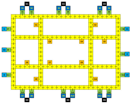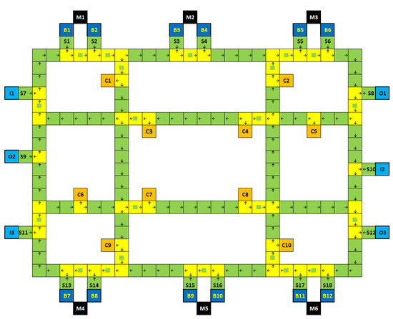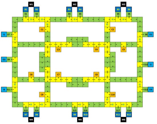 The principle adopted for all transportation system layouts consists of deadlock-free zones marked in green and deadlock-risk zones in yellow. The length of the side of the squares is set to 1[m]. There are 18 stations. Close to the stations are buffers marked in blue. Buffers: , and are input points to machines. Buffers: , and are output points from machines. There are 6 machines: , , , , , and , marked in black. Operations are performed on these machines. There are 3 sources of work-pieces: , and , marked in light-blue. Each source generates 20 parts (a part per second) at the beginning of the simulation. There are 3 sinks for work-pieces (disposal points): , and , also marked in light-blue.
