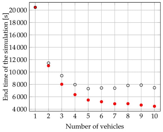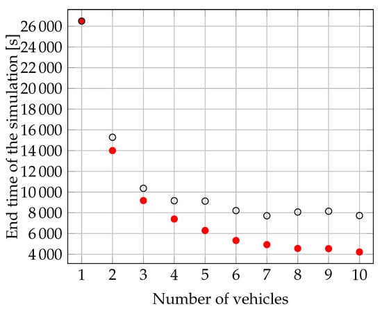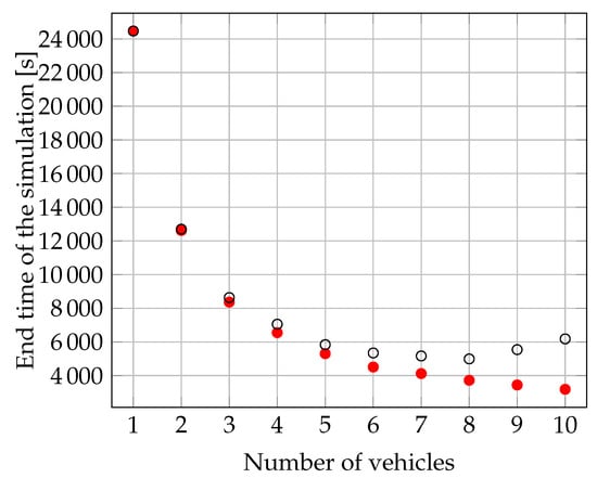 In Figure 6, the empty circles show the results of the original SOCP method in which the process reservations are made before the transport tasks start, while the red circles show the results of this method for a system using a new type of deadlock-free zone, which enabled the process reservation procedure to be carried out in a phased manner. As can be seen, the use of the new type of zone allowed a significant reduction in transport task completion times of up to 49% when 10 AGVs were used.