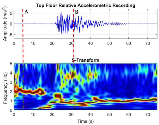 The band-variable filter is based on the Stockwell Transform [43], a time–frequency representation of a time-series that overcomes the limitations due to the assumptions of stationary behavior. Under the assumption of linear behavior over a short time interval, the S-transform allows analysis of the nonlinear behavior of any dynamic system, also during strong motion phases [44]. The Stockwell Transform operates simultaneously in both the time and frequency domains.