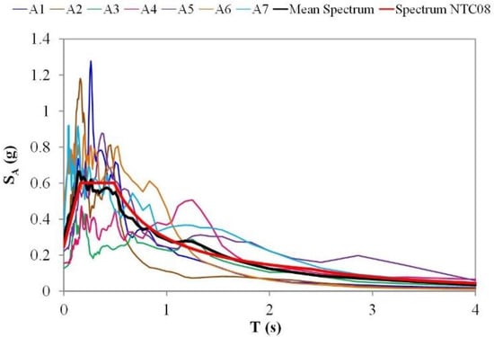 Response spectra related to the seven natural accelerograms (A1 to A7, representative of soil class B) used within the numerical analyses.