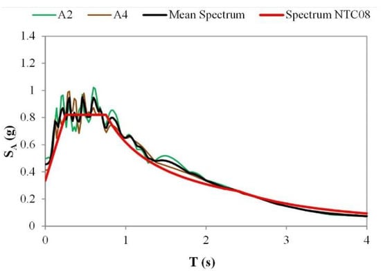 Response spectra related to the two artificial accelerograms (A2 and A4, representative of soil class D) used within the numerical analyses.