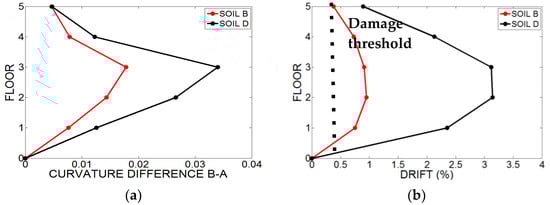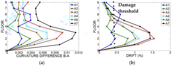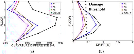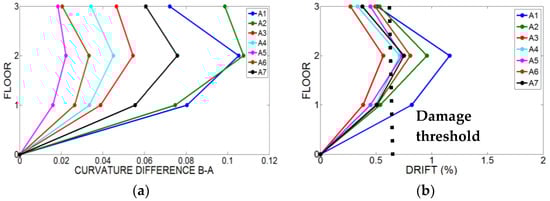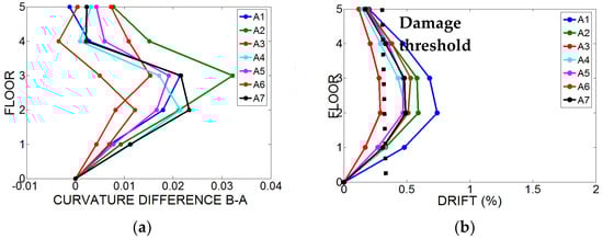 The curvature difference between the two time-instants (B) and (A), and the inter-story drift, are plotted from Figure 9, Figure 10, Figure 11, Figure 12 and Figure 13 for all the numerical models.