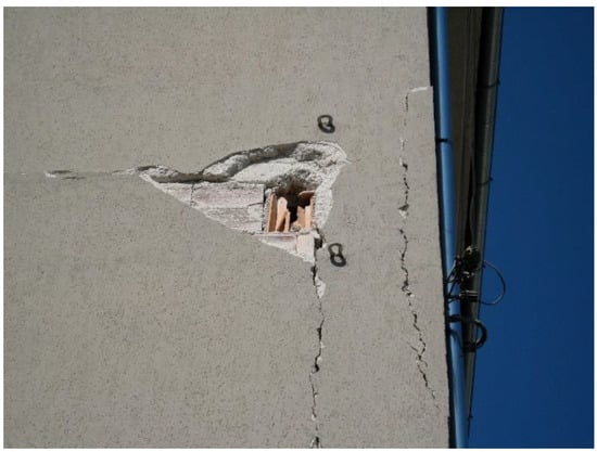 Concerning the structure, some beams showed cracks due to the shear action (Figure 19), particularly those loaded by the one-way slab. As reported in [3], the columns’ damage was particularly heavy and extensive at the first level. Possibly, damage on columns was increased by the interaction with the adjacent infill panels [3]. For the same reason, even structural damage on some beam–column joints was found (Figure 19).
