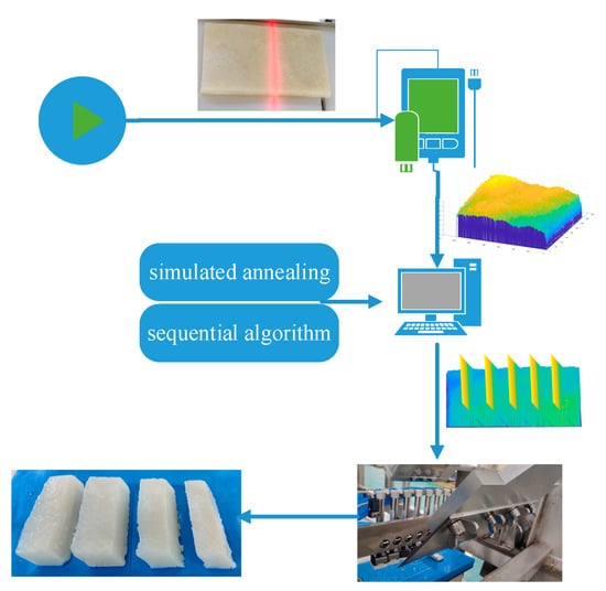 - Dibet Garcia Gonzalez, N.A.; Figueiredo, R.; Maia, P.; Lopez, M.A.G. Automated vision system for cutting fixed-weight or fixed-length frozen fish portions. In Proceedings of the 8th International Conference on Pattern Recognition Applications and Methods, Prague, Czech Republic, 19–21 February 2019; Springer: New York, NY, USA, 2020. [Google Scholar]