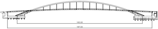 The bridge has a main span of approximately 130 m and two side spans of about 30 m (Figure 2). The bridge comprises two outwardly inclined arches made of fabricated ‘tear drop’-shaped tubular steel supporting stiff transverse frames positioned at 8.5 m intervals. The arches rise 10.6 m above the crown of the deck at midspan, giving a span-to-rise ratio of about 12:1 [62]. Construction began in 2008 and it was inaugurated in May 2011.