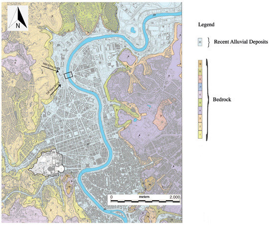 Figure 4. Excerpt of the lithological map of the Rome area (http://www.urbanistica.comune.roma.it/images/uo_urban/prg_vigente/prg_g9_1_00.pdf, accessed on 17 May 2021). The black box highlights the perimeter of the geological 3D model reported in Figure 5.