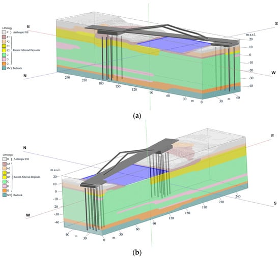 Figure 5. Three-dimensional geological model of the Ponte della Musica subsoil. In Figure 4 is the location of the area covered by the model. (a) View from NW; (b) view from SW.