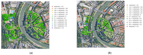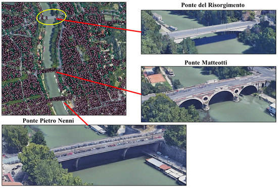 Figure 15 and Figure 16 show that bridges with high stiffness and with the piles in the riverbed (Ponte Matteotti, Ponte Pietro Nenni, Ponte Flaminio and Ponte Milvio) are almost covered by the satellite measurement points. By contrast, at Ponte Risorgimento and Ponte Duca d’Aosta the points detected by the satellite are not located on the deck, similar to the case of Ponte della Musica.