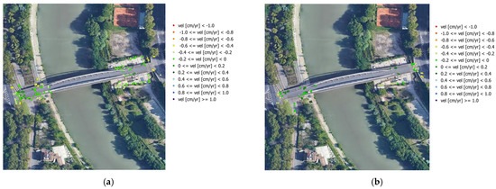 Figure 7. False colors mean deformation velocity maps of the study bridge: (a) ascending and (b) descending orbits.