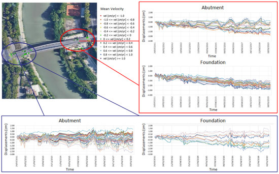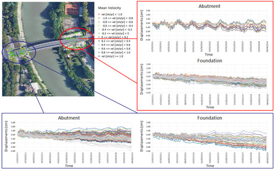 Figure 7 clearly shows that the points detected by the satellite are present only on the bridge abutments and foundation but not on the deck. The deformation velocity ranges from −0.4 to 0 cm/year. It should be noted that the exploited multi-temporal coherence (defined in [40]) values of the represented points relating to both the ascending and descending orbit range from 0.35 to 0.55.