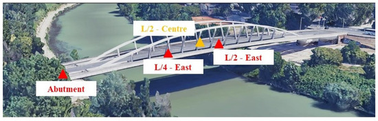 In October 2020, an experimental campaign of ambient vibration measurements was carried out to evaluate the main frequencies of the structure. Velocimetric stations were installed on the span at L/2, both at the center and on the east edge, at L/4 on the east edge and on the abutment (Figure 10).