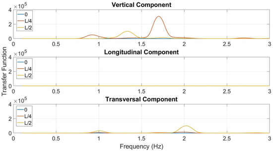 In order to evaluate the transfer function of the monitored bridge, the acquired recordings have been firstly corrected for baseline and filtered between 0.1–30 Hz using a band-pass filter. Secondly, the Welch spectra have been evaluated for each channel of each velocimetric recording and, finally, the transfer functions have been evaluated considering the station located at zero as the reference station. The first three eigenfrequencies characterizing the dynamic behavior of the monitored bridge are the following: