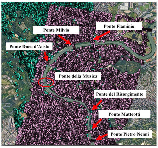 Figure 15. Measurement points detected by the satellite on the infrastructures located south of Ponte della Musica.