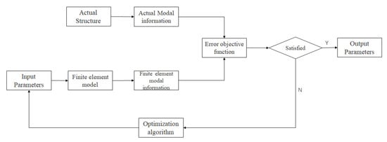 In the problem of structural damage identification based on the optimization algorithm, by adjusting the parameters of the finite element model, the response data of the finite element model is close to that of the actual model, so that the structural parameters of the actual model can be obtained. The key is to reduce the error between the measured data and the calculated data as much as possible. In this paper, the modal information data are used to construct the objective function, and the specific process is shown in Figure 1.
