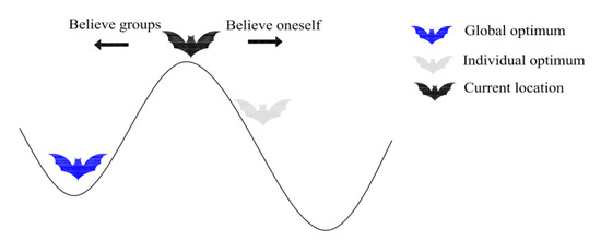 Inspired by the position update mechanism of PSO and combined with the individual historical optimum position, the exploration formula of DBA has been improved in this study. Individual historical optimum position refers to one of the best positions of each particle in the iteration process. As shown in Figure 2, the current optimal solution is in a local optimal situation. Without combining the individual optimal solution, other bats will be close to the current optimal solution, resulting in the algorithm being unable to identify the optimal solution of the objective function. When the individual optimum is added, the other bats are subject to the traction of the global optimum bat position on the one hand, and the traction of their own optimum position on the other hand. By adjusting the parameters of the step size, the possibility of jumping out of the local optimum is increased. Moreover, if the bat is in the individual optimal position, the value of the individual optimal term is 0. Therefore, the exploration formula is combined with the individual optimal solution, and the expression formula is as follows: