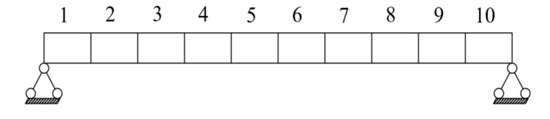 The beam-type bridge model is shown in Figure 4, with a total of 10 elements and 11 nodes. The moment of inertia of the beam is , the young’s modulus of elasticity is , the mass density is and the cross-sectional area is . The first five natural frequencies and the corresponding modes of vertical degrees of freedom are used to identify the structural damage.