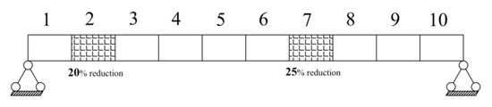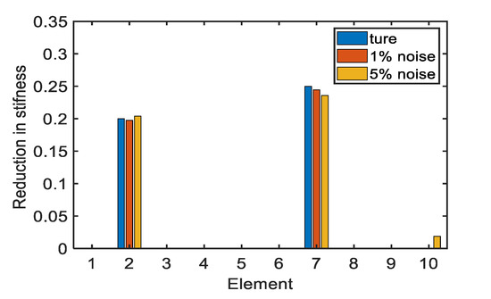 The numerical simulation process is completed by matlab2020b software. The damage of the beam-type bridge model is shown in Figure 5. The stiffness of the second element and the seventh element are reduced by 20% and 25%, respectively.