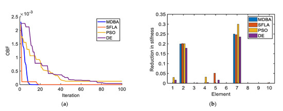The stiffness is identified by MDBA, PSO, DE and SFLA under the same population number and iteration times. The convergence graph and identification result without noise of different optimization algorithms are shown in Figure 6 and Table 1. It is clear that all the algorithms could identify the damage location. From the point of view of identification accuracy, MDBA had the highest identification accuracy, and its maximum relative error was only 0.05%. The maximum relative error of other algorithms was 1.36% (SFLA), 20% (PSO) and 10.95% (DE), respectively. The accuracy of SFLA was better than that of PSO and DE, but SFLA and PSO had small misjudgments in the undamaged area. As can be seen from Figure 6a, the MDBA algorithm had the fastest convergence speed of all the algorithms, and its number of iterations was only 10 when the objective function reached its optimal value. Though the SFLA algorithm shows better convergence than MDBA at the beginning, the iterations times with the optimal objective function was about twice that of MDBA. Therefore, the proposed MDBA had faster convergence speed and better identification accuracy than those of the other three algorithms in the case of small population and few iterations.