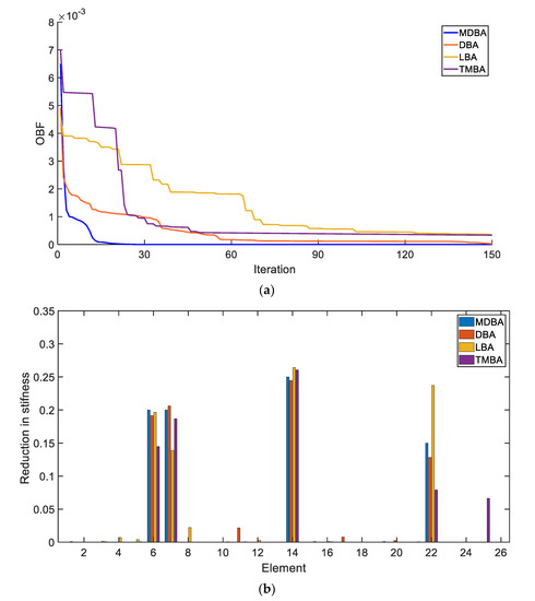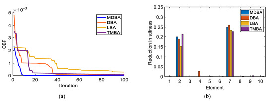 To verify that the MDBA algorithm has better superiority than other improved methods of BA, MDBA was compared with other bat variants algorithms (DBA, LBA, TMBA) in this simulation. The convergence graph and identification result without noise of different bat variants are shown in Figure 7 and Table 2. It is clear in Figure 7a that under the condition of the same small population and few iterations, MDBA had a faster convergence rate than other bat variants. All of the four algorithms could accurately find the damage location of structure, but the MDBA had the best identification accuracy in damage degree, and its maximum relative error was only 0.05%. The maximum relative error of other bat variants algorithms were 5.7% (DBA), 8.6% (TMBA) and 23.4% (LBA), respectively. DBA had a small error alarm in element 4. Due to the small population and few iterations, the other three variations of BA did not perform well in the accuracy of structural damage identification. Therefore, the proposed MDBA has better superiority under the condition of a small population and few iterations.
