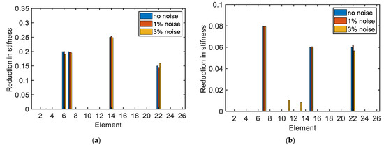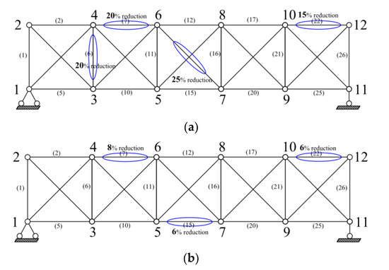 Two kinds of damaged cases were set; case 1 was the complex damaged case with multiple damage of members; case 2 was the small damage cases with multiple damage of members, as shown in Figure 10a,b. The MDBA was verified by applying different degrees of noise to the modal information.