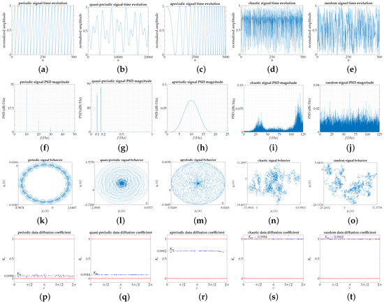 Concerning the 0–1 test, the diffusion model characterized by the graphic representation of versus , Figure 1k–o, describes how the system generating a given signal tries to fill in the surrounding bi-dimensional space. The periodic signal draws up a precise orbit, well-bounded in space; the aperiodic signal covers the entire space bounded by a restrictive area. Conversely, the chaotic and random signals tend to expand erratically by the surrounding space; the dispersion speed is higher for the random signal, according to the coordinate values of the graphic representation, because the chaotic signal is recurring and it usually confirms a clear tendency towards some regions (darker areas) to which it visits most frequently. The quasi-periodic signal presents an intermediate behavior between periodic and aperiodic since it covers the space circumscribed to a restricted area but describing regular paths, in our case elliptical, that do not overlap given the irrational relationship between the constituent frequencies of the signal.