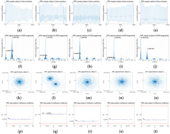 (These pictures are made available for downloading in Supplementary Materials.) Each column corresponds with a subject (five individuals chosen randomly); the number of points: 30,000. (a–e) PPG signals, with amplitude normalized to the interval —for visual clarity, only 5000 points of each PPG signal are shown; (f–j) Power Spectrum Density (PSD). Two prominent peaks are clearly visible in each PSD, related to the respiratory (lower frequency peak) and heart (higher frequency peak) rates, whose values are indicated in bold text; (k–o) Representation of Equation (1) for , with points; (p–t) results of the modified 0–1 test, for 100 random c values, with correlation method.