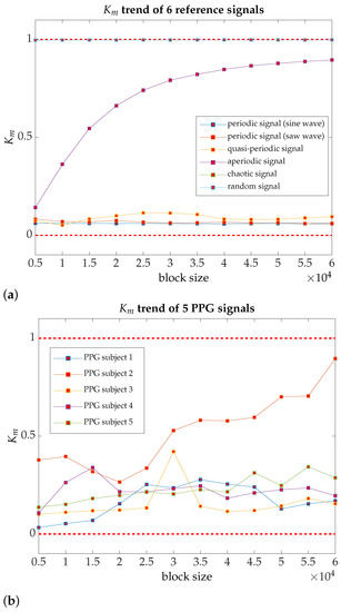 The results summarized in Table 2 also indicate the trend, namely, the cumulative effect of as the size of the data block increases, starting with a 5000-point data block and in 5000-point incremental steps. So is calculated for an initial 5000-point data block, then 10,000, 15,000, and so on up to 60,000 points, taken from the mid-session of the signal acquisition phase. The parameter trend allows evaluation of how changes as more data are added in the computation of ; so somehow, it enables the measurement of new operational modes (very low-frequency components of the PPG signal), as more minutes of the PPG signal are added to the analysis. Based on the results of a small timescale analysis of the PPG signal in healthy young people, we can draw that most of the PPG signals have a quasi-periodic behavior [46] (see Figure 3a,b to a complete description). We do not omit to express that several publications provide for a clear linkage between biological signals and quasi-periodic behavior but not with an accurate definition of what is meant by quasi-periodicity property, such as mentioned Ganeshapillai and Guttag [48].